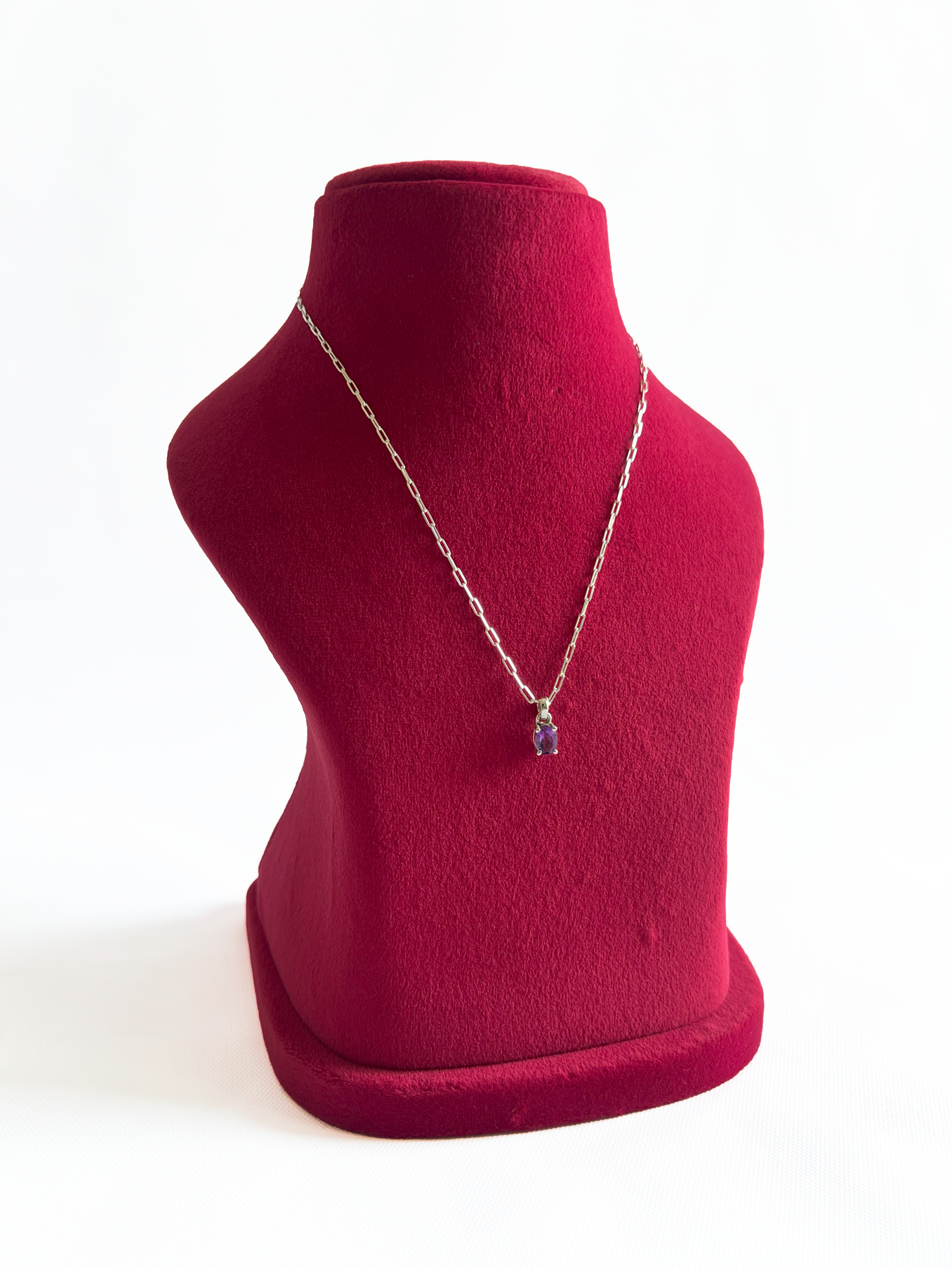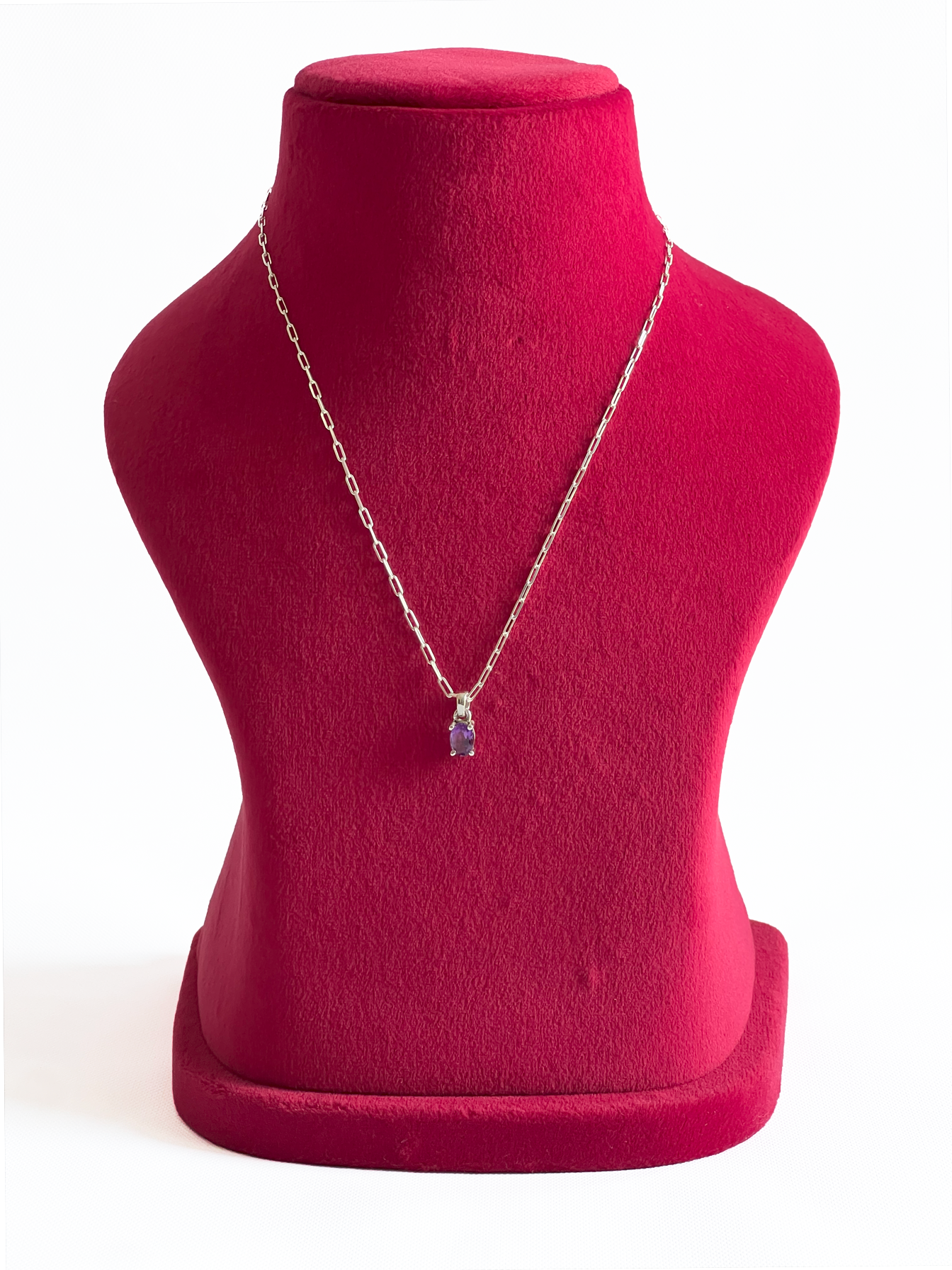 Soothing purple amethyst pendant on a silver chain — a token of wisdom and peace.