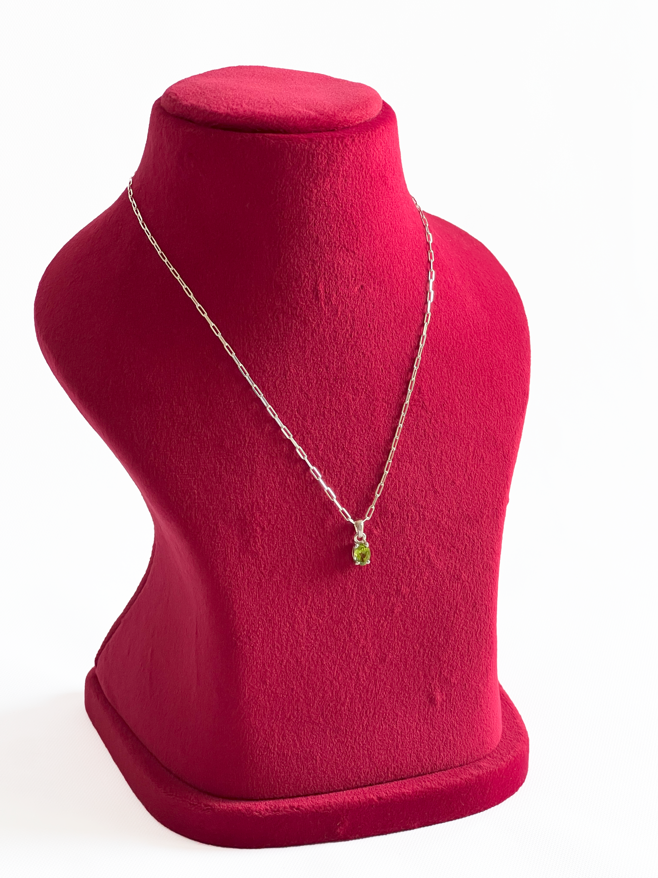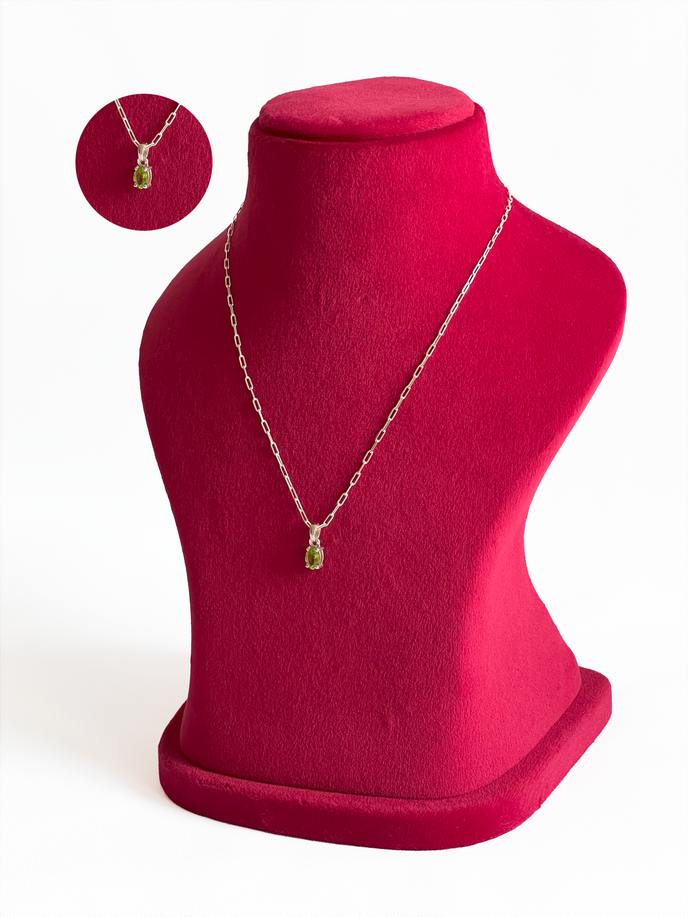 Fresh green peridot pendant on silver chain — radiating happiness and protection.