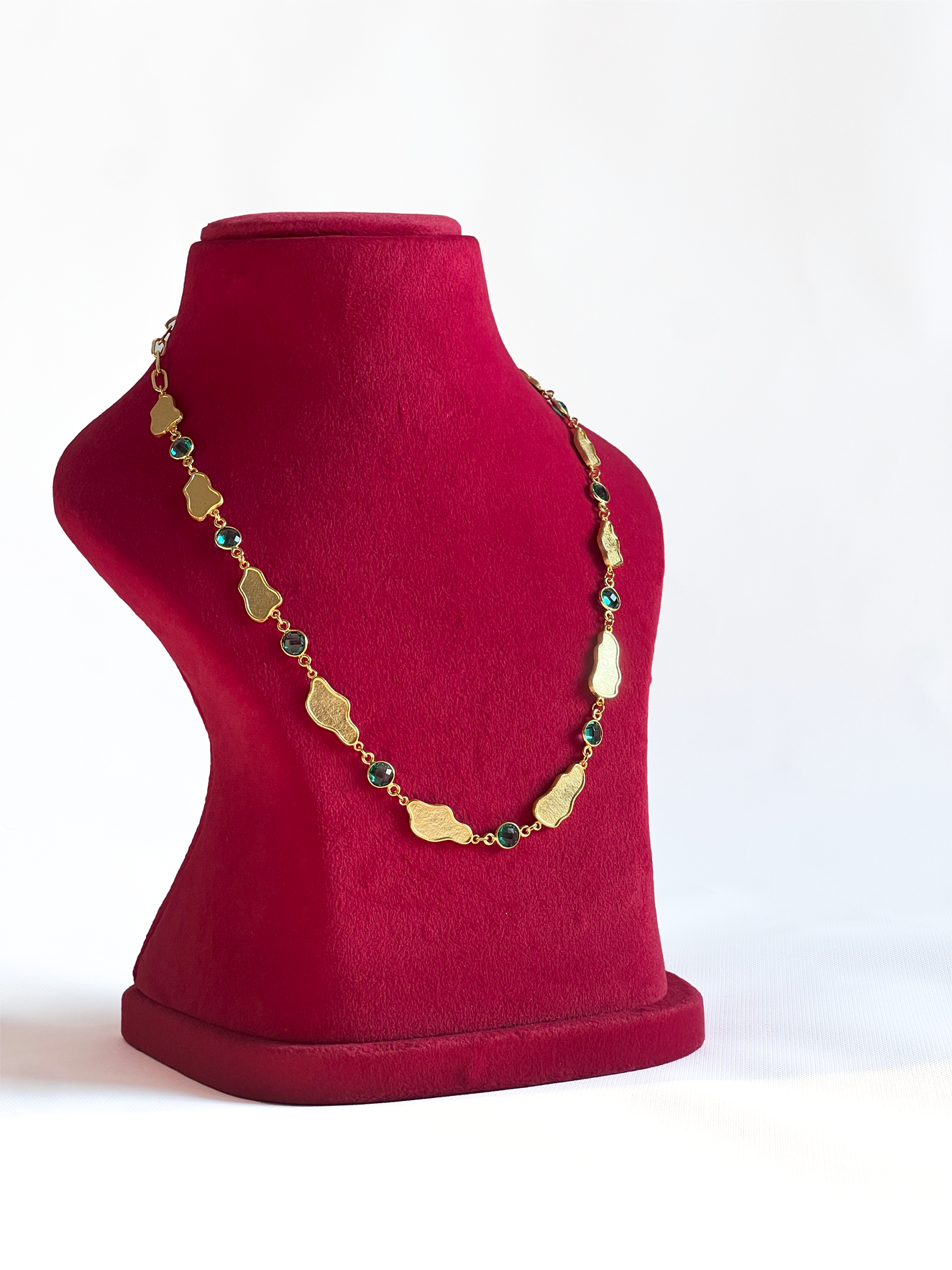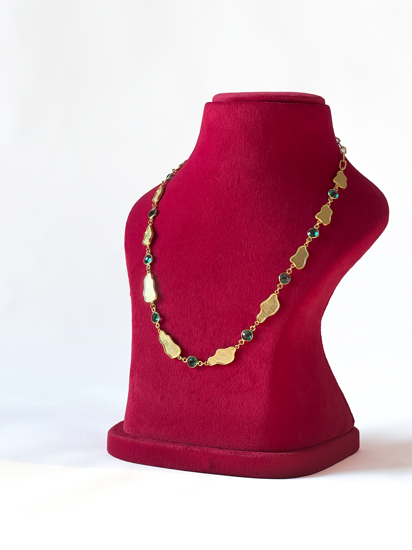 Gold-plated chain with abstract gold charms and vibrant blue-green apatite stones.