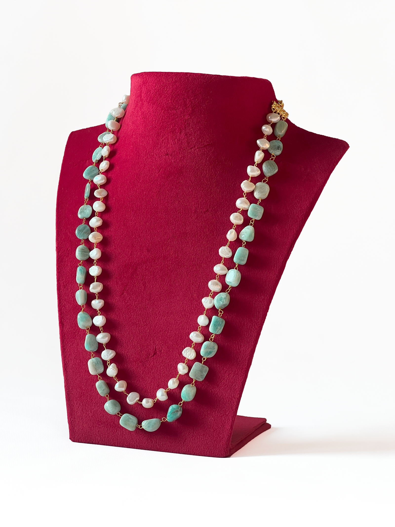 A stunning handcrafted double-strand necklace featuring natural aqua-toned stones and freshwater pearls. Each bead is carefully linked with gold-tone connectors, creating a balanced mix of oceanic blues and creamy whites. Elegant and versatile, perfect for both everyday wear and special occasions.