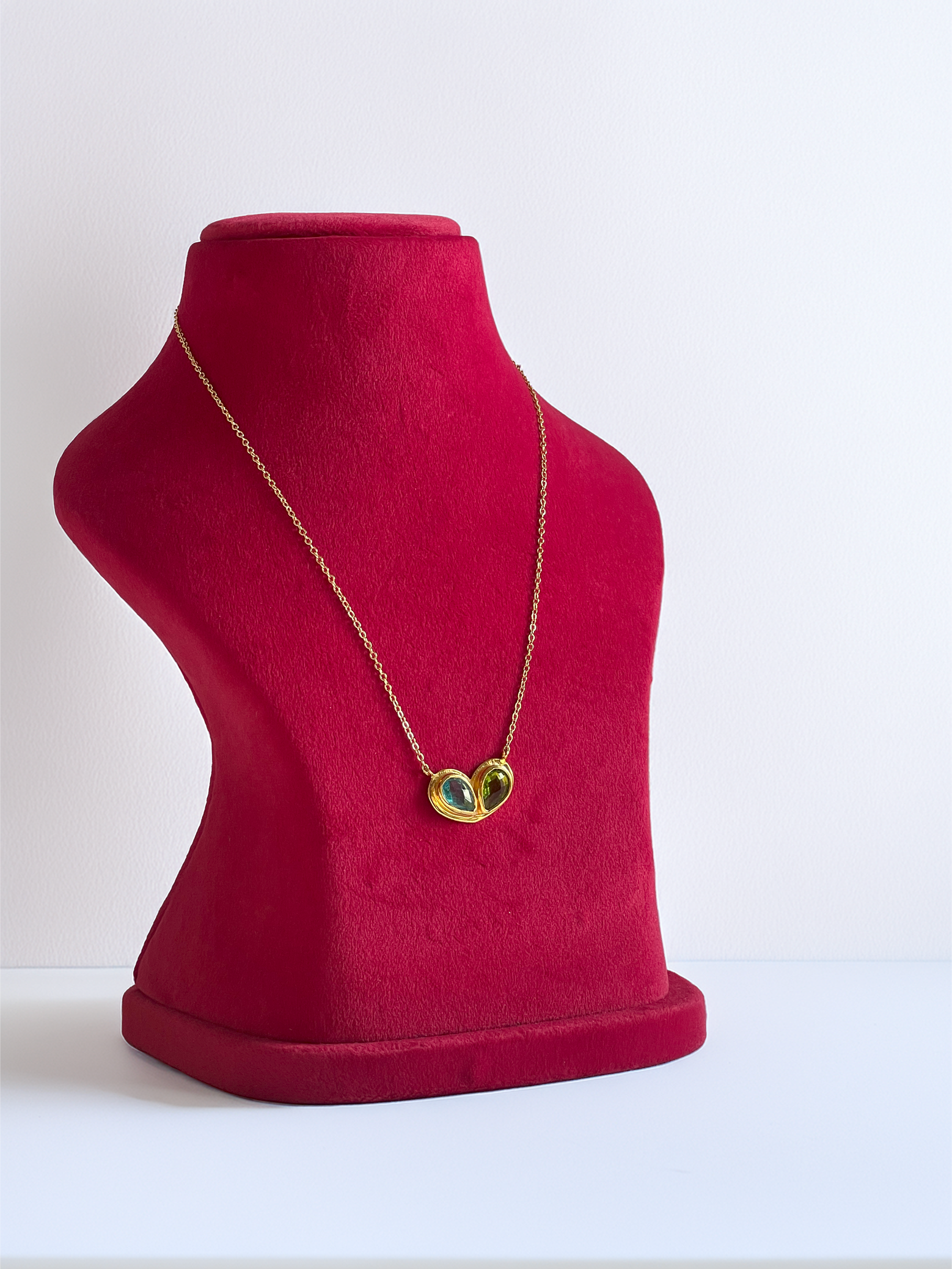 A romantic and vibrant necklace featuring a heart-shaped pendant set with two radiant gemstones — blue topaz and peridot — framed in 18K gold plating. The unique dual-stone design symbolizes love, harmony, and positive energy, making it a meaningful piece for everyday wear or gifting.