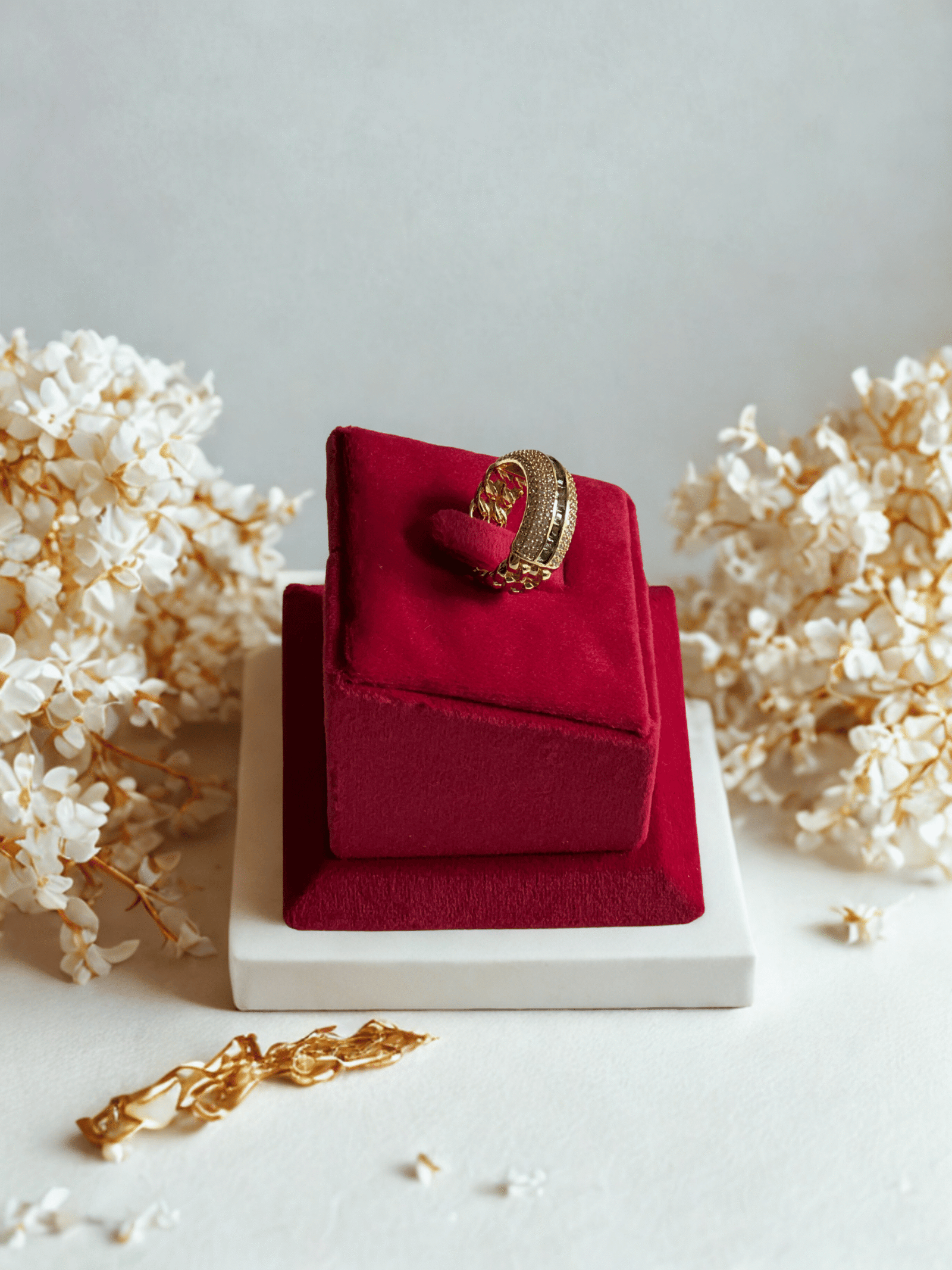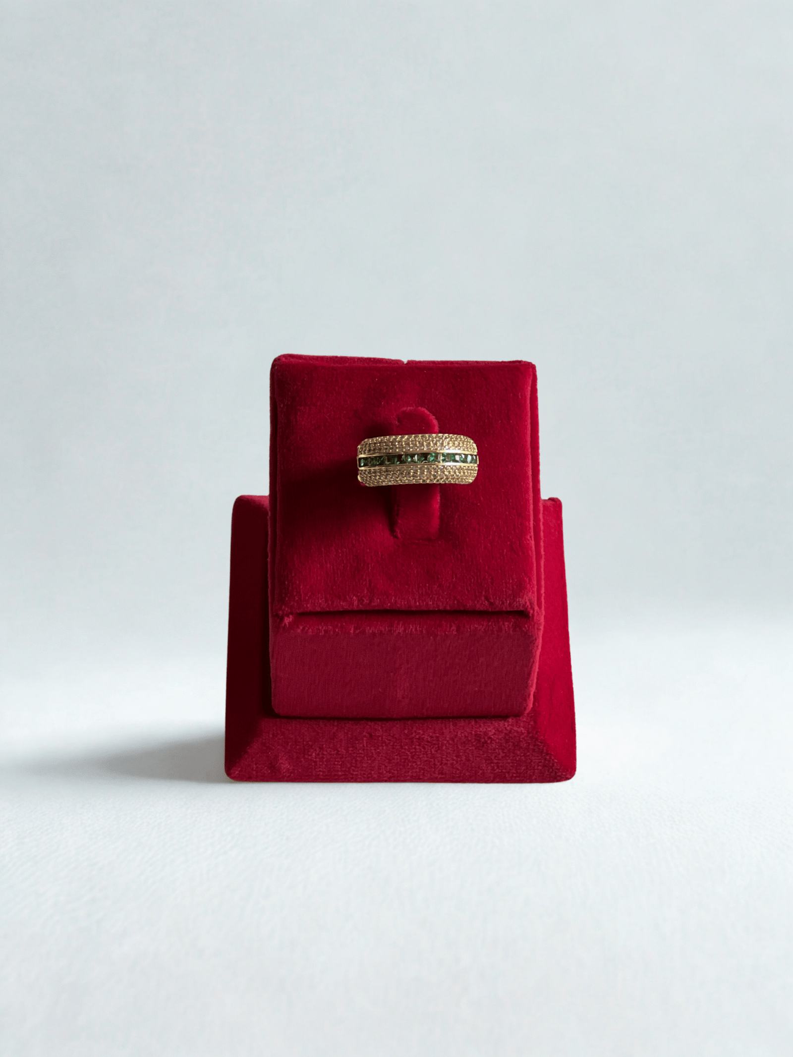 A bold gold band ring featuring a textured design with a row of sparkling green emerald-like stones at the center. A perfect mix of luxury and everyday wear.