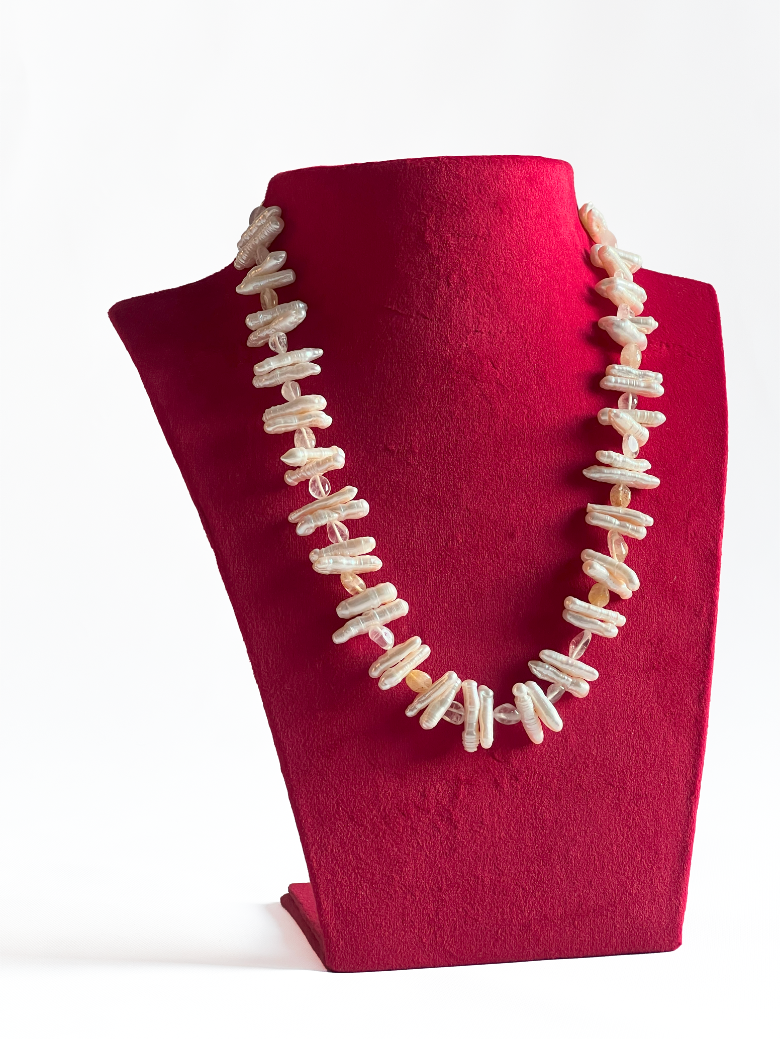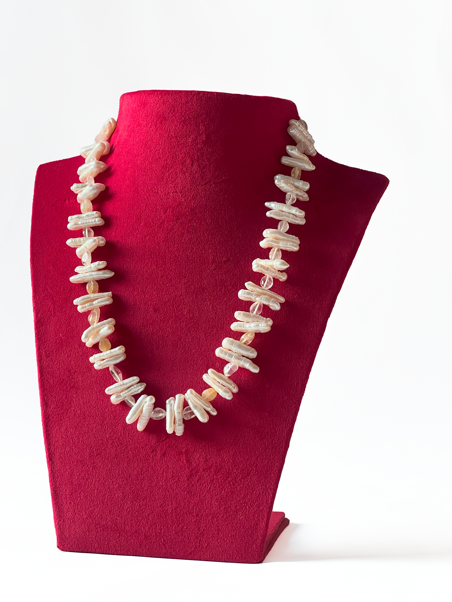 This striking statement necklace features naturally shaped stick pearls, each with its own unique texture and glow. The irregular silhouette of the pearls gives a contemporary and artistic feel while keeping the timeless elegance of pearl jewelry. Perfect for adding sophistication to evening wear, festive outfits, or even minimal modern looks.