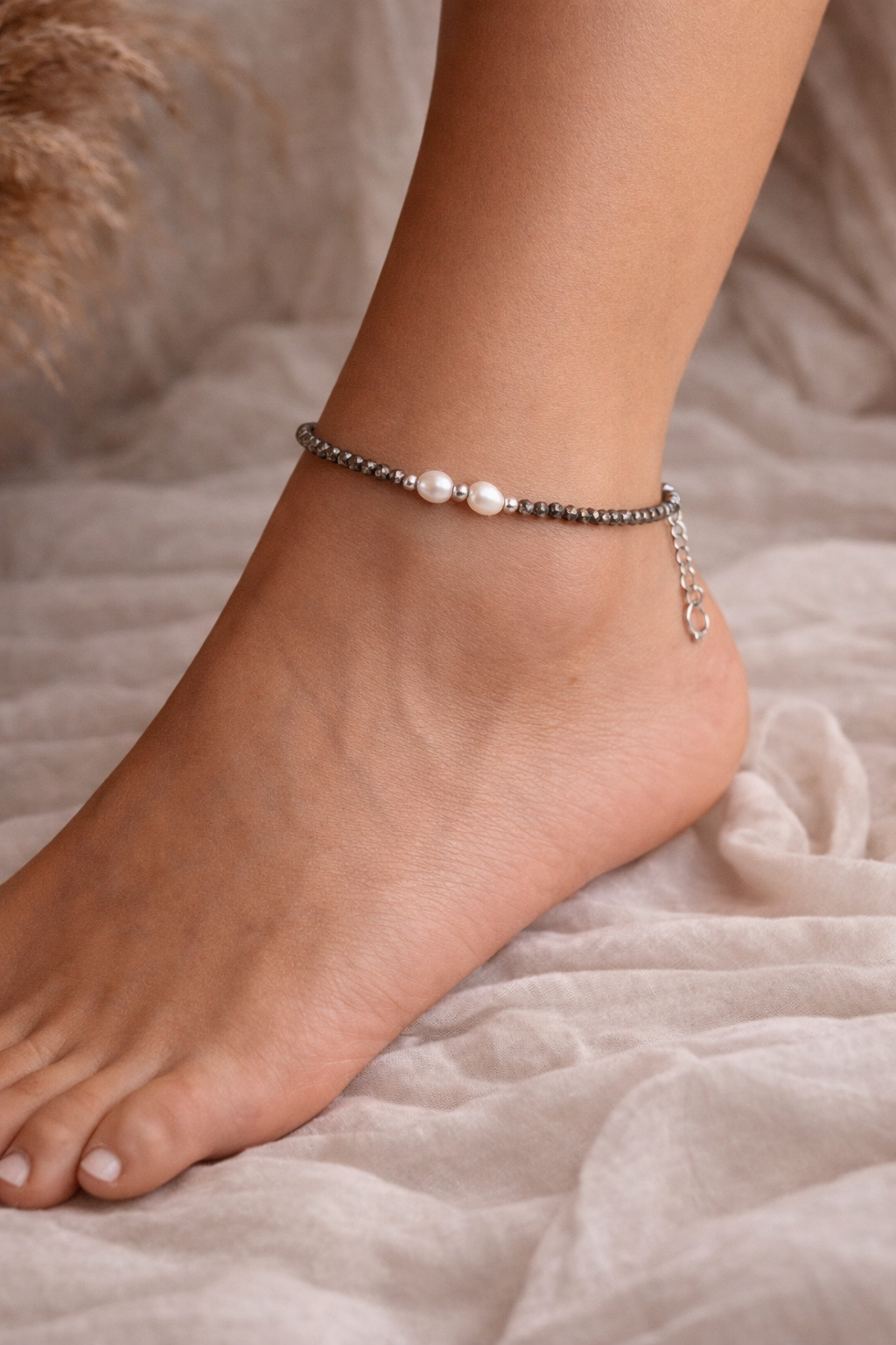 Grounded in strength and finished with elegance, the Pyrite & Pearl 925 Silver Anklet brings together raw energy and timeless beauty.