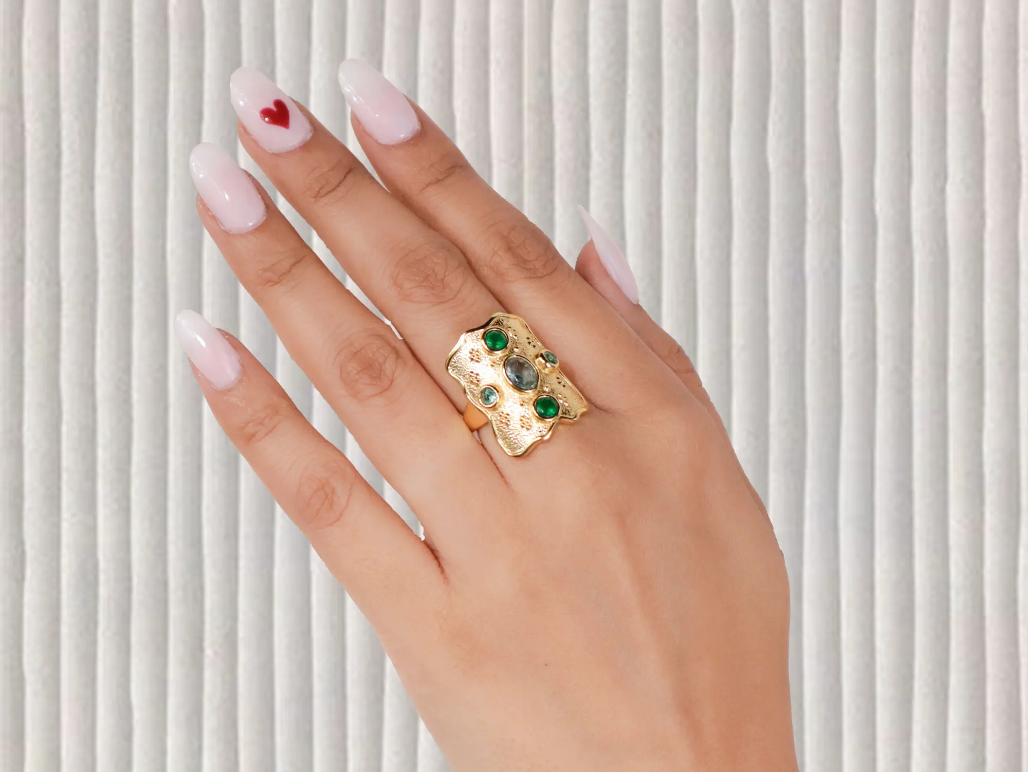 A bold gold statement ring with textured detailing and gemstone variations — pink, multi-color, black, and green. Perfect for festive and modern looks.
