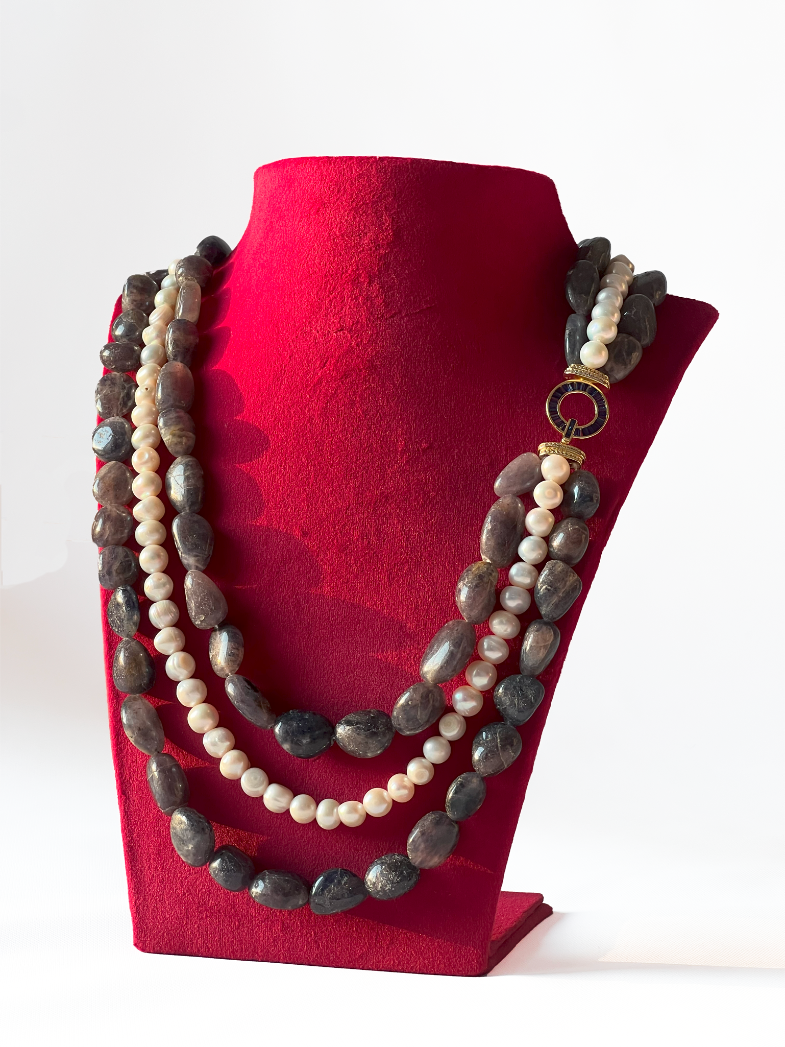 This handcrafted three-layer necklace blends the mystic beauty of labradorite with the timeless elegance of freshwater pearls. Designed with a striking gold-plated circular clasp that doubles as an accent detail, it offers a refined yet modern look. Ideal for weddings, evening parties, and formal occasions, this versatile piece adds sophistication to any outfit.