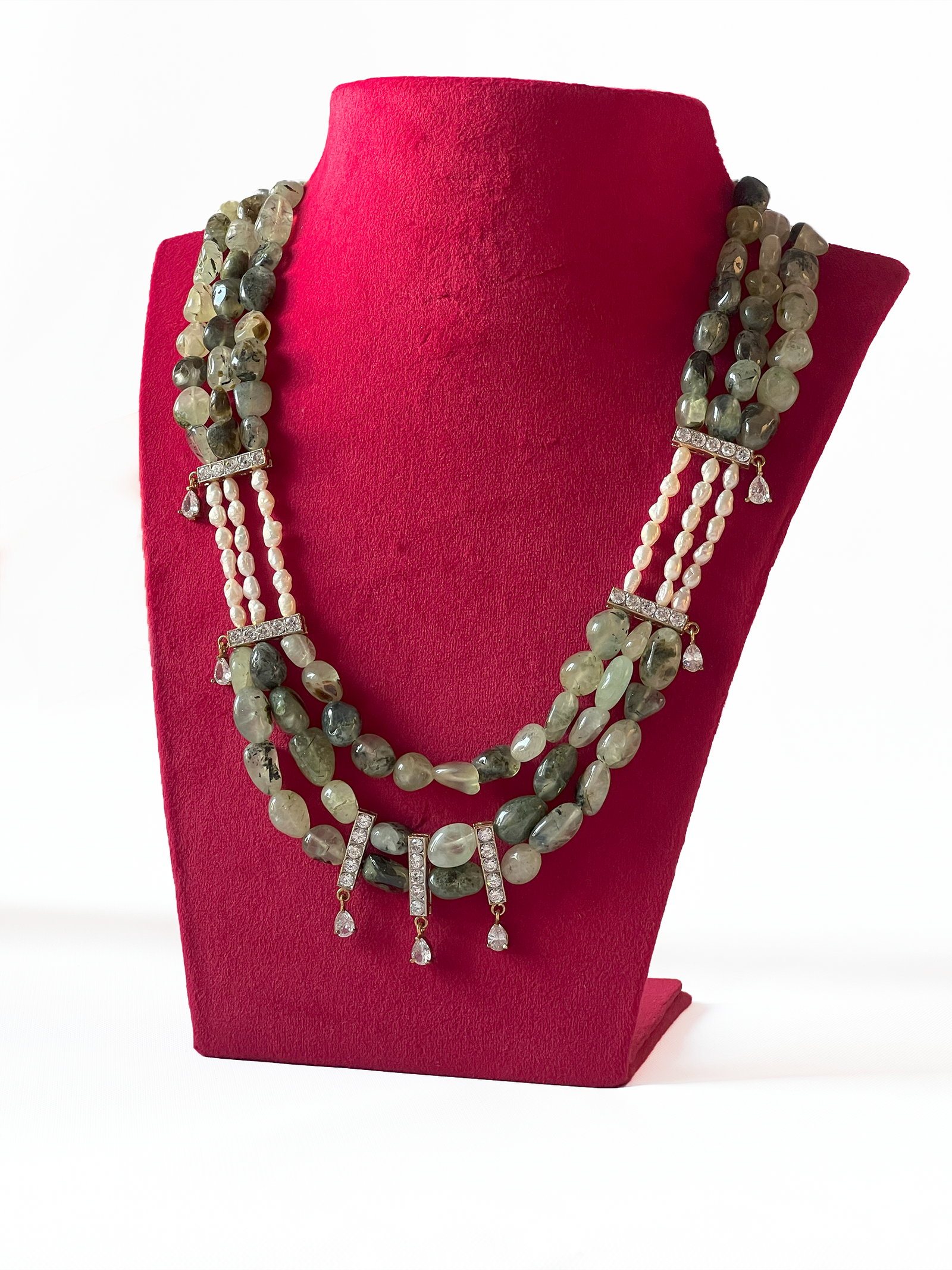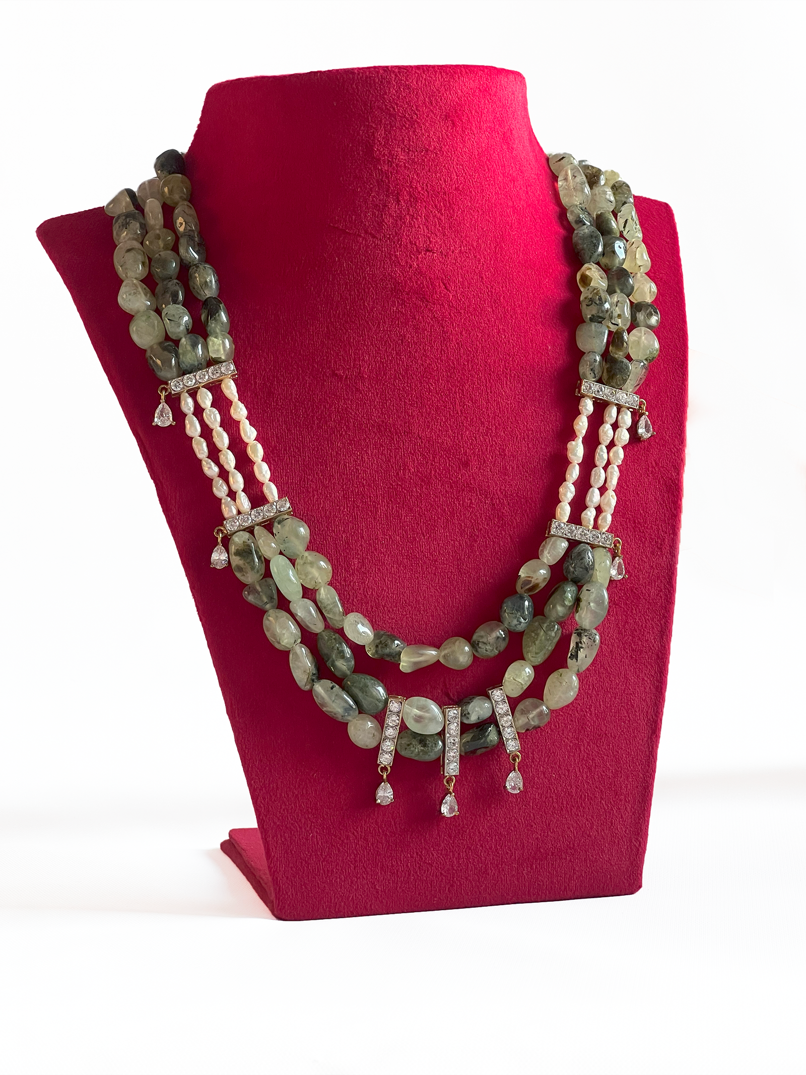 Elegant three-layered necklace with natural gemstone beads, lustrous pearls, and sparkling CZ accents — perfect for weddings, festive occasions, and statement looks.