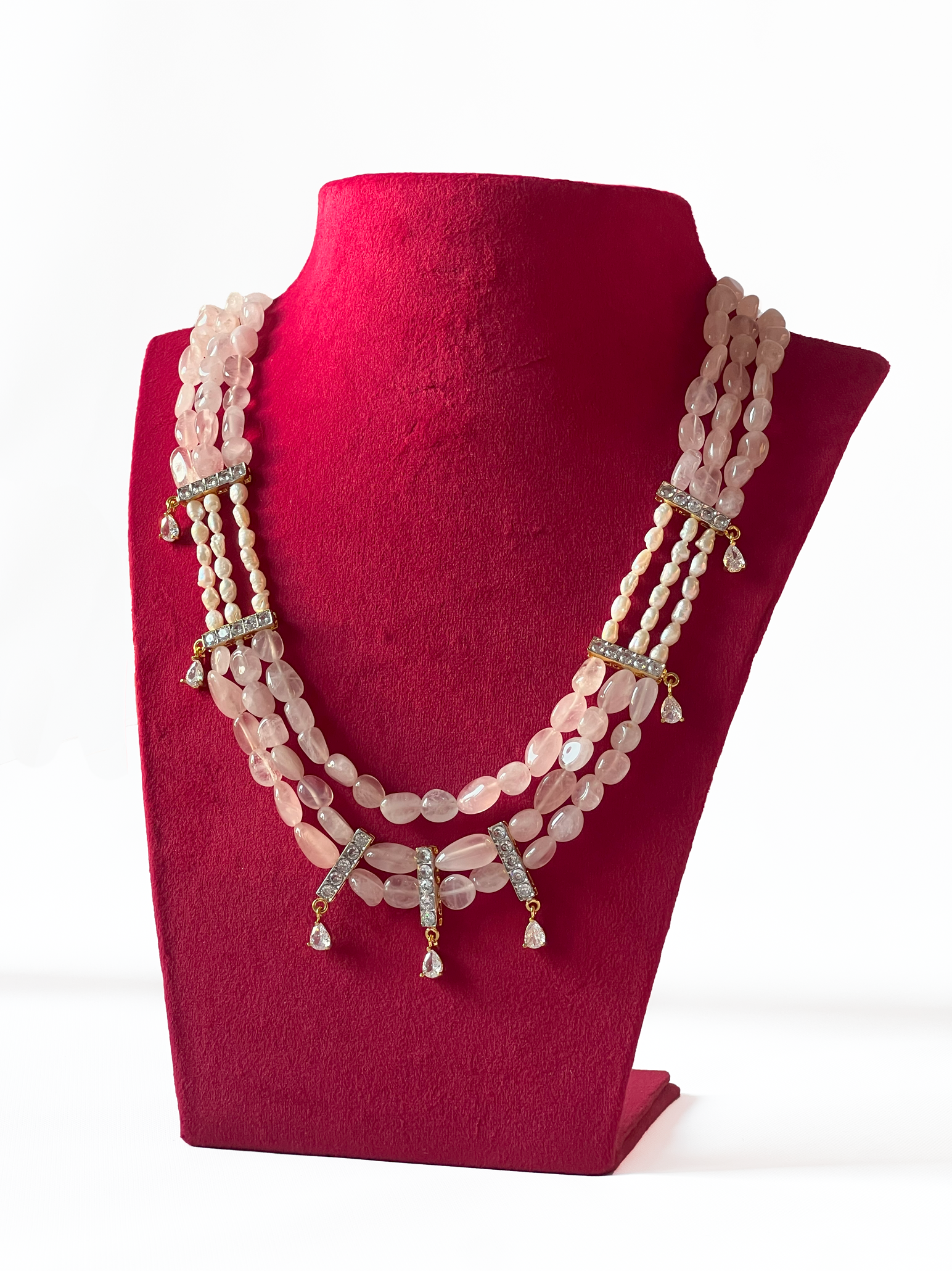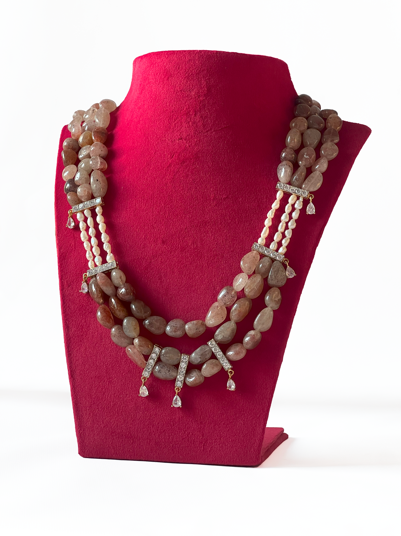 This triple-layer necklace is handcrafted with carefully selected natural gemstones and freshwater pearls, accented with sparkling cubic zirconia bars for a luxurious finish. Designed to sit beautifully on the neckline, it blends timeless elegance with modern sophistication. Ideal for weddings, festive wear, and special celebrations.
