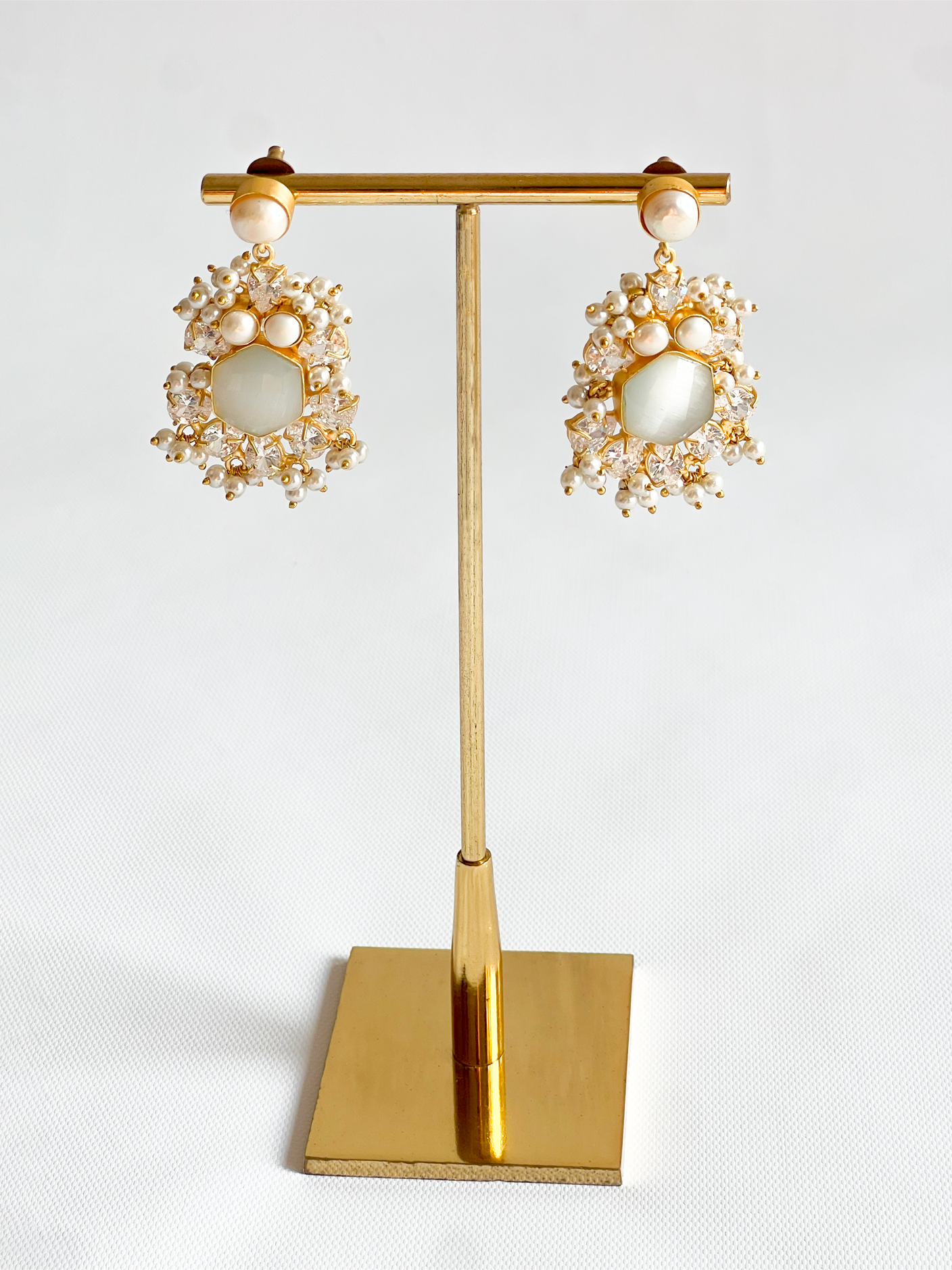 Elegant gold-plated earrings featuring white chalcedony, framed with delicate pearls and cubic zirconia clusters — a timeless blend of sophistication and grace.